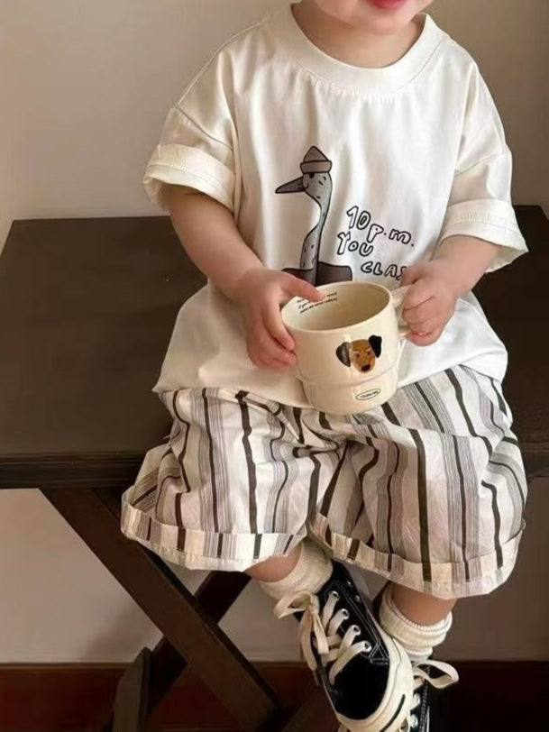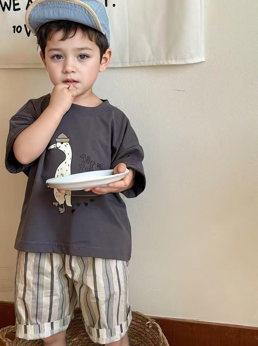 · الطبعة الأمامية: رسمة طريفة لطائر (يشبه الإوزة) يرتدي قبعة، مع خطوات أقدام مرسومة بجانبه، تضيف لمسة مرحة وشخصية للتيشيرت.