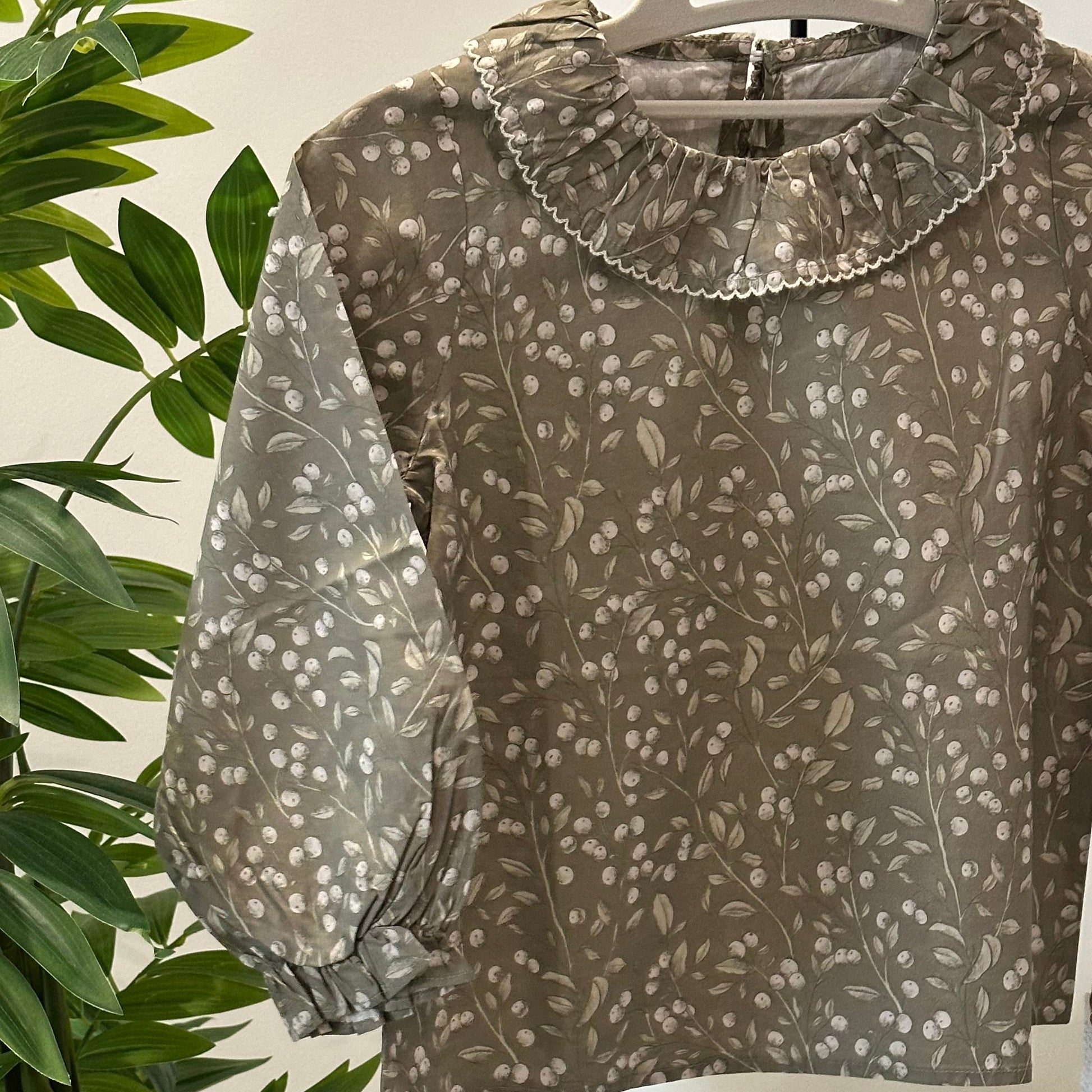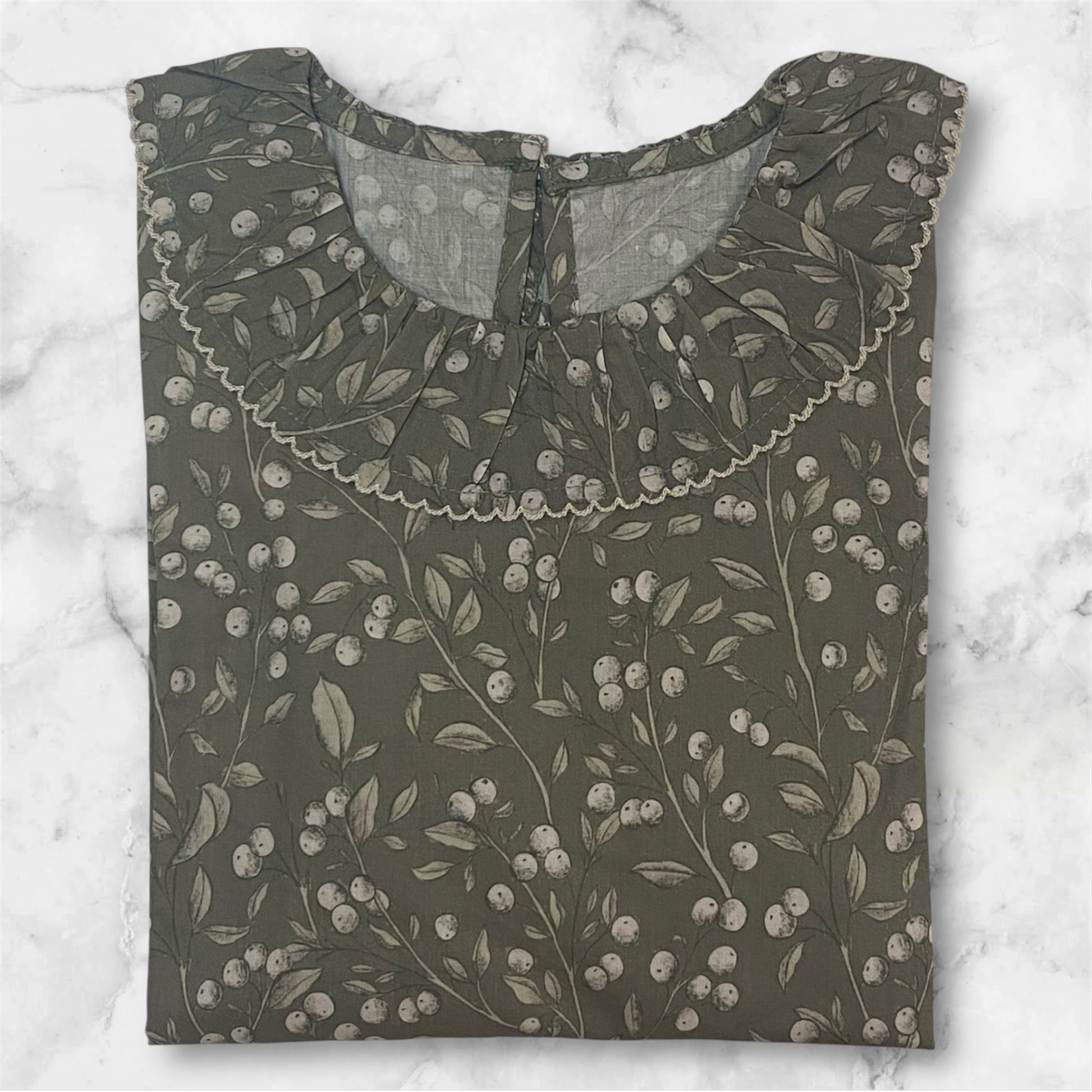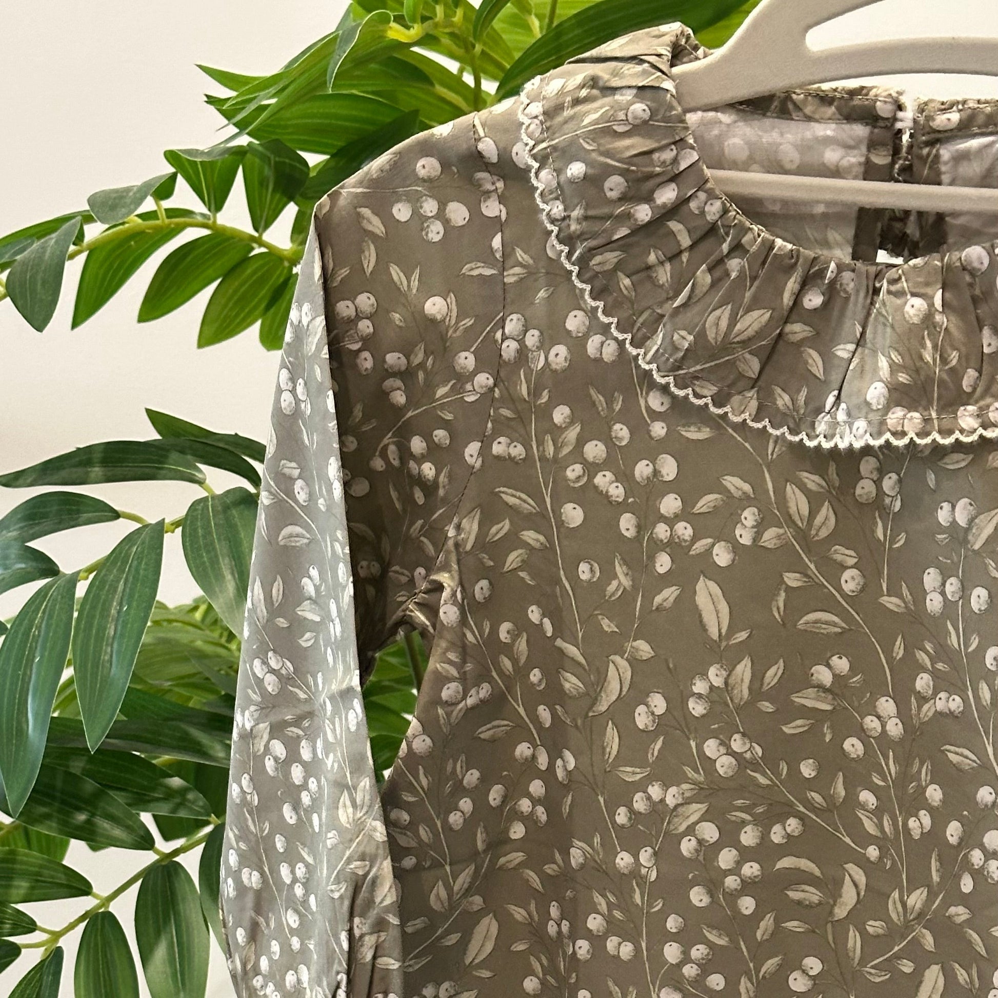·       النقشة: طبعة ناعمة لأغصان وأوراق صغيرة بلون أبيض، موزعة بتناغم على كامل القماش.